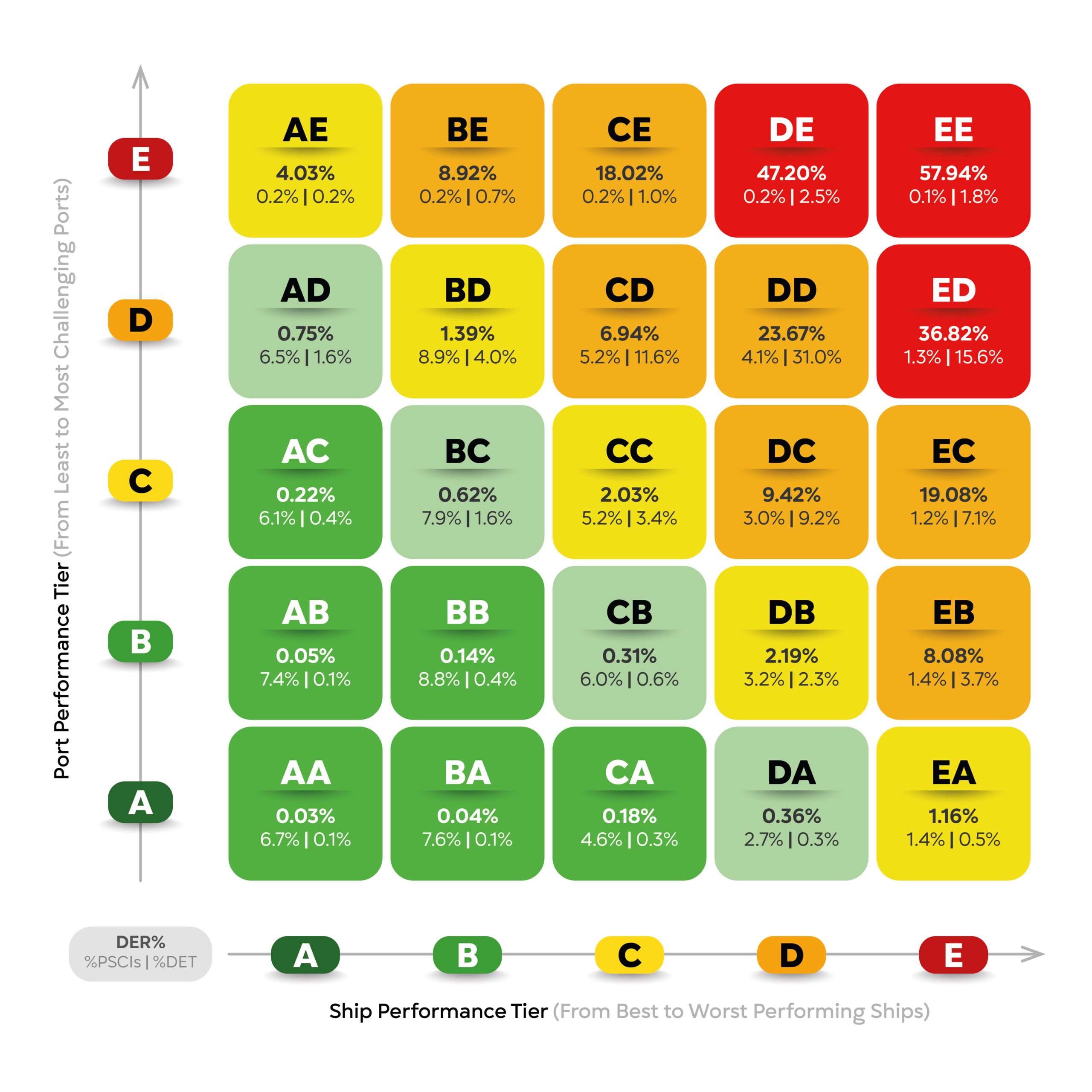 This matrix is based on over 230,000 inspections in the last 36 months, classifying every case into one of 25 SPOT zones (Ship Tier A–E vs Port Tier A–E).
