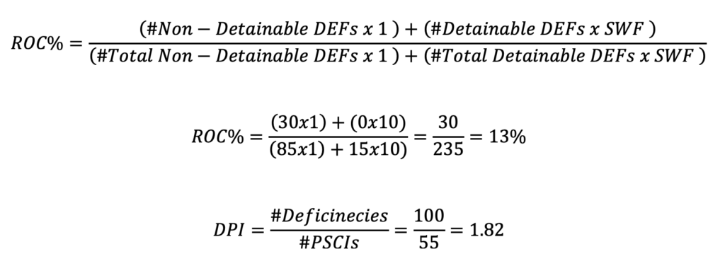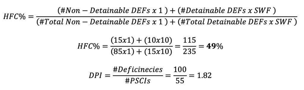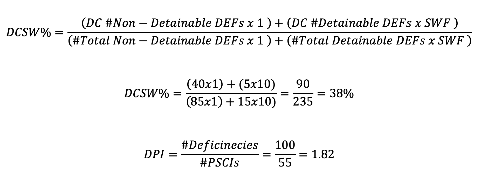DCSW% = (# of Non Detainable DC Deficiencies x 1 + # of Detainable DC Deficiencies x SWF) /  (# of Total Non Detainable Deficiencies x 1 + # of Total Detainable Deficiencies x SWF)